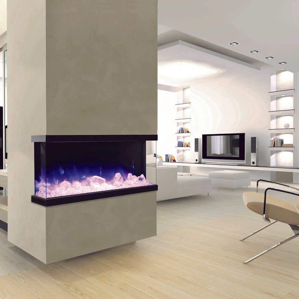 The Amantii Tru View XL Deep series 3-sided electric fireplace is truly innovative! The gorgeous flame presentation and unique media options can now be viewed from almost any angle through 3 sides of glass viewing area.